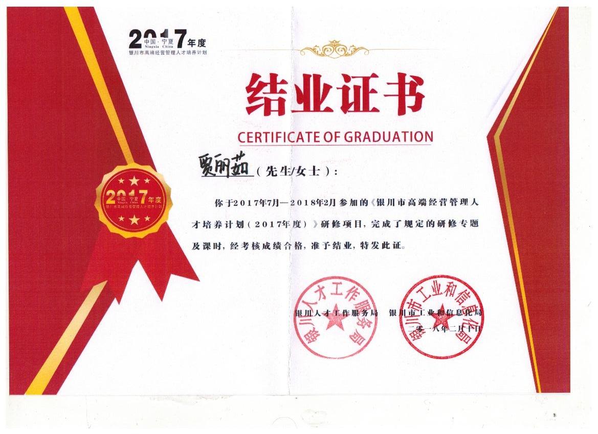 賈麗茹銀川市高端經(jīng)營管理人才培養(yǎng)計(jì)劃(2017年度)結(jié)業(yè)